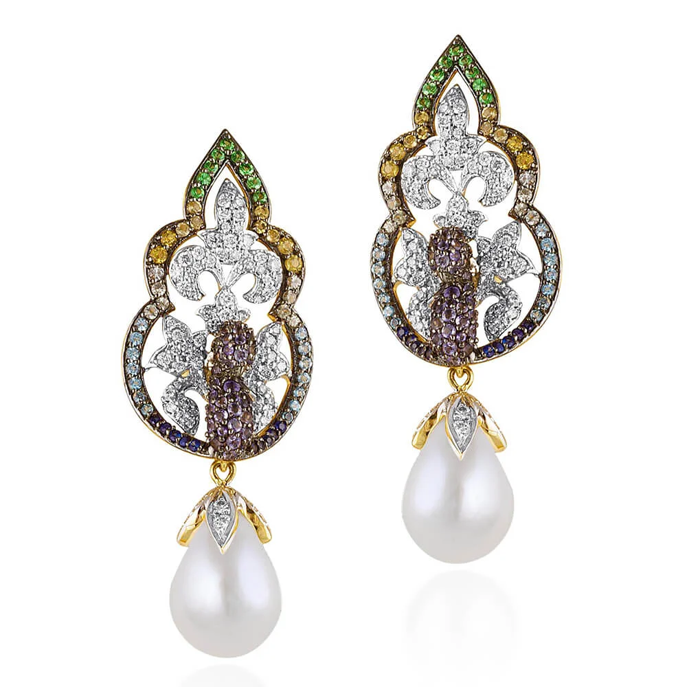 A peacock design pendant and earrings set, adorned with various gemstones, weighing 20.18 carats, is set in 15.28 grams of 18K gold.