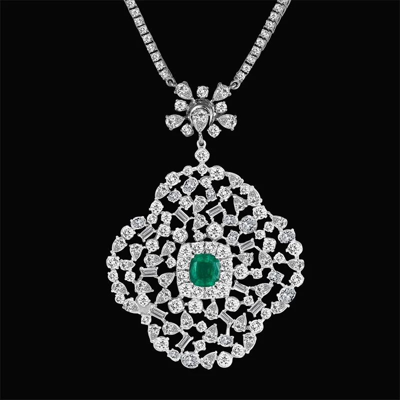 Two dazzling emeralds, weighing 2.33 carats, sit at the center of each earring in this eye-catching Ma Passion design. The diamonds, weighing 7.29 carats, are cut in varying ways to bring out the floral characteristics of the design that brings to focus the pear-shaped emeralds at the center of each earring. The earrings are set in 17.84 grams of 18K gold.