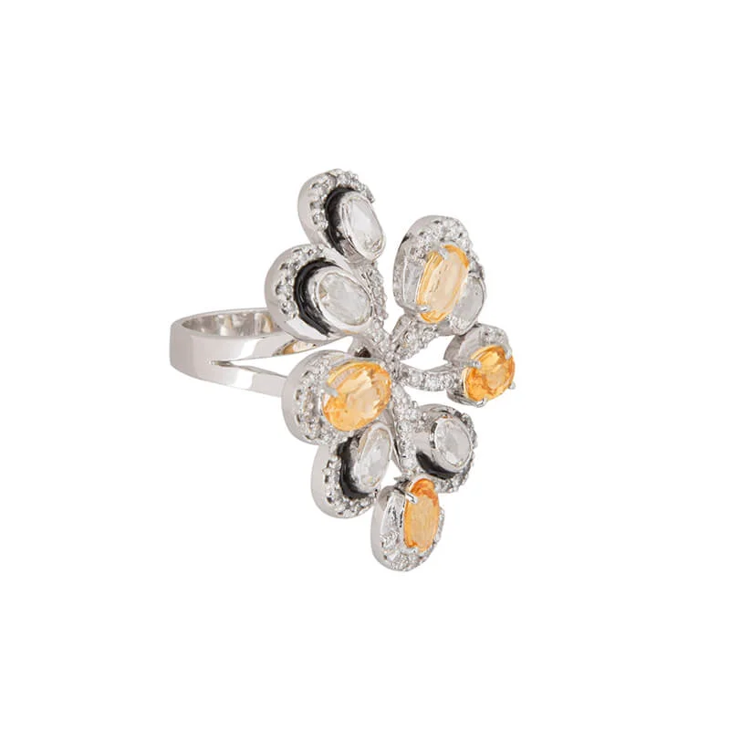 4 oval-shaped imperial topaz cut stones, weighing 2.55 carats, adorn this exquisite ring set in 13.35 grams of 18 K gold. The mélange of uncut and round diamonds, weighing 1.96 carats are outlined with black meena work.