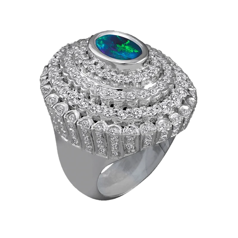 Four ascending layers of round-cut diamonds, weighing 2.30 carats, encompass a rare black opal from Australia. The blue and green hues of the opal resemble the characteristics of The Earth and remind us that the gifts of nature are truly unique and unparalleled. The black opal weighs 1.55 carats, and the statement ring is set in 15.93 grams of 18K gold.