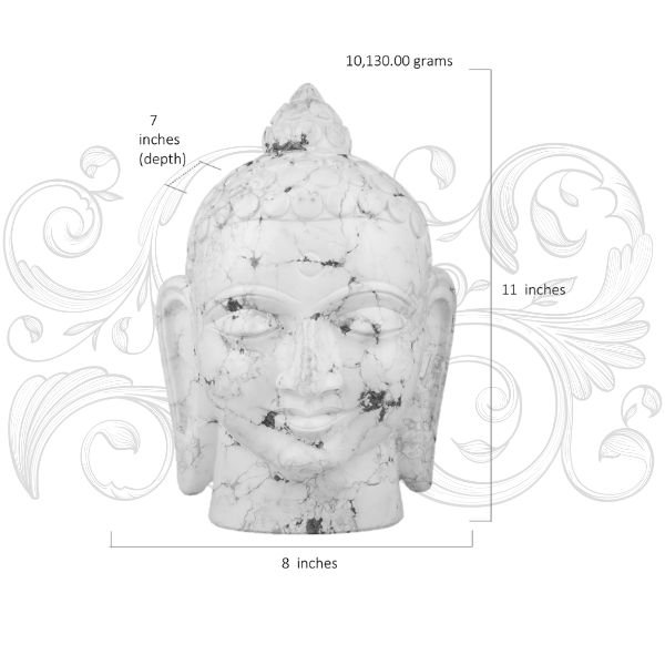 A stone found in California USA, Howlite is an ultra-rare stone: a real-estate development on top of the California mine has closed off access to the stone forever. Chalky white, with black veins running through it, the stone gives this placid Buddha Head a distinctive character. Carved by a kaarigar that specializes in carving of Buddha, this creation in Howlite is a true collectible.