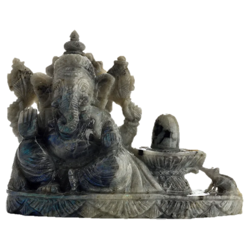 Rarer than the blue and black specimens of Labradorite, White Labradorite is unique in its combination of white with blue firing. From Madagascar, this stone was delivered into the hands of a master craftsman in Rajasthan who created the figure of Lord Ganesha using the knowledge and skill of his ancestral art. The Lord in His emblematic pose is seated next to a Shivling – the representation of Lord Shiva – creating a powerful symbol of divinity and positivity.