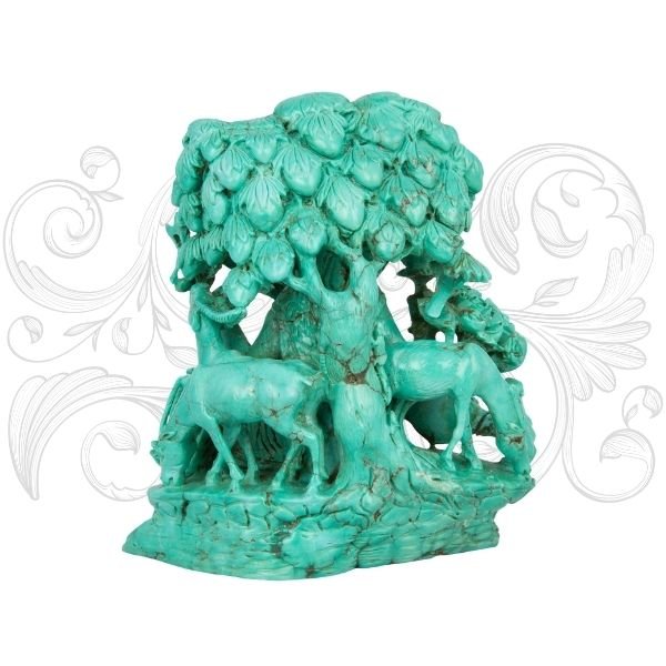 This Ma Passion creation is intricately carved by our master gemstone carver from Rajasthan. Carved on all four sides, the different varieties of leaves and trees and the many species of animals adds to the splendour of the carving. The kaarigar has paid attention to every inch of this exquisite piece of Turquoise from China, portraying Goddess Saraswati playing her veena in the heart of nature. Chinese turquoise is characterized with black veins running through it, adding to the stone’s dynamic beauty. Regarded as a stone that attracts luck and protection by the ancient Chinese cultures, Turquoise lends itself beautifully to this creation that is a potent symbol of beauty and purity.