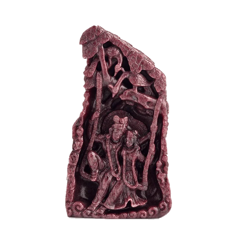 Showcasing a strong resemblance to ruby, Thulite, the National Stone of the Scandinavian country of Norway, is a reddish-pink treasure. In this creation, Radha-Krishna, the ultimate symbol of love, are beautifully etched into the stone. They are shown sitting on a jhoola that hangs from a tree branch. The two peacocks above them, along with the other surrounding birds are turned towards them, mesmerized by their presence. The consistent structure of the stone, along with the matte finish that appears after polish makes this carving a true collector’s delight.