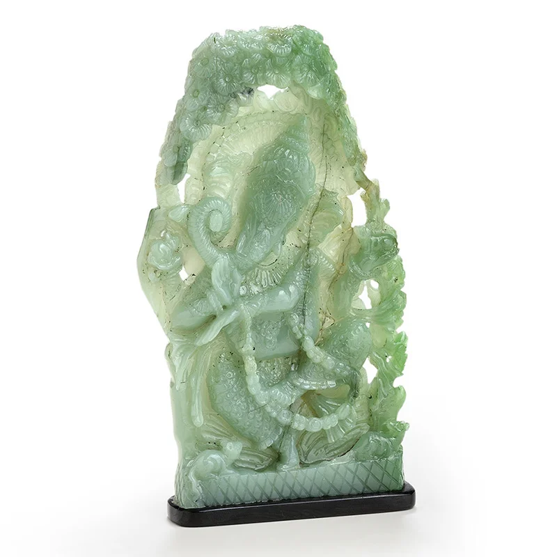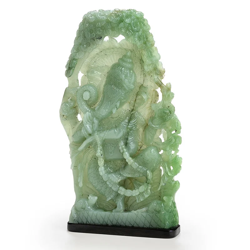 Imperial Nephrite Jade is extremely difficult to mine, given the remote locations of the Siberian mine from which it is sourced. The stone has a layered crystallization that makes it challenging to carve; it is brittle. Our master craftsman has managed to add an almost tangible seamlessness to this depiction of the God of Wisdom dancing to His own rhythm. It is a true amalgamation of balance, technique, and skill in a creation that will never be seen again.