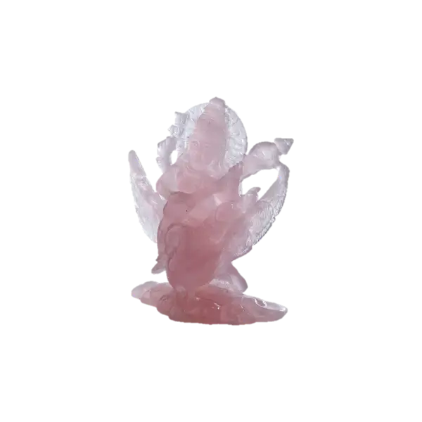 This delicately crafted figurine features Goddess Saraswatiji gracefully seated on a swan, carved from vibrant Rose Quartz. The sculpture radiates elegance and purity, symbolizing wisdom, learning, and artistic inspiration.